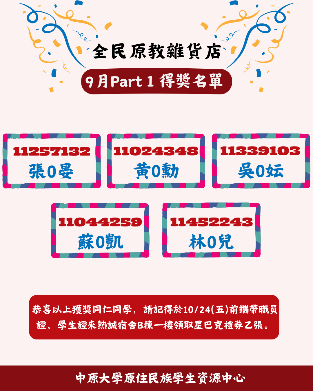 得獎者於本日至10/18星期五前至原資中心(熱誠宿舍男宿一樓)找原資中心助理簽領獎品!